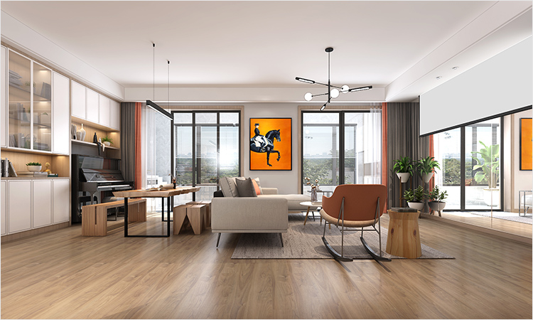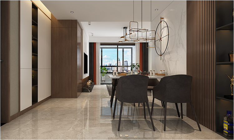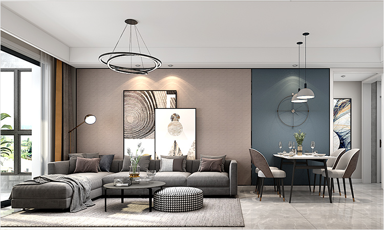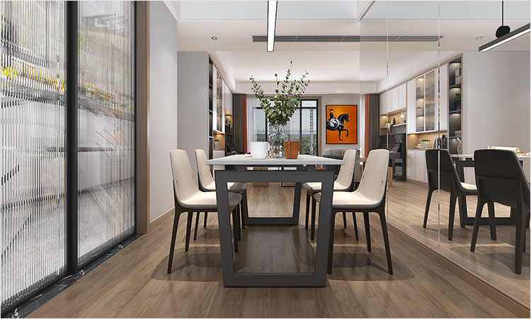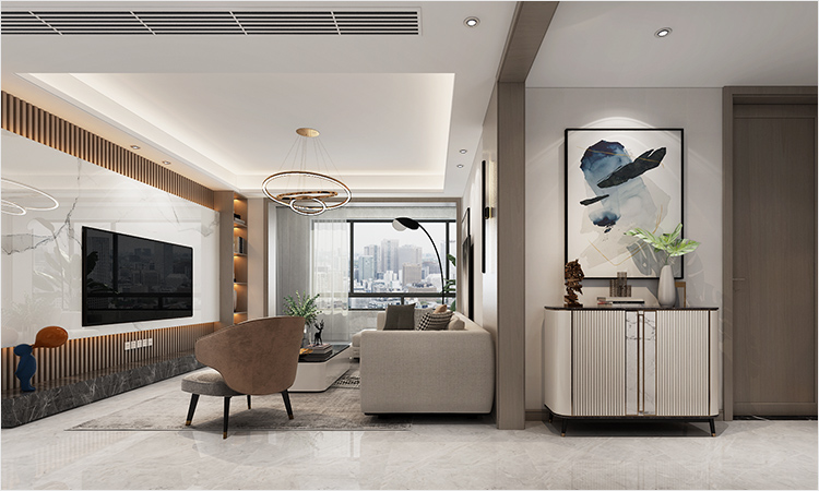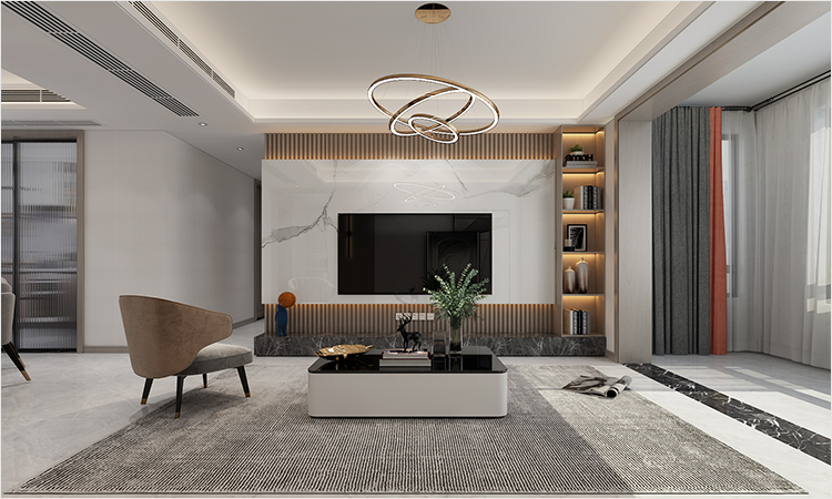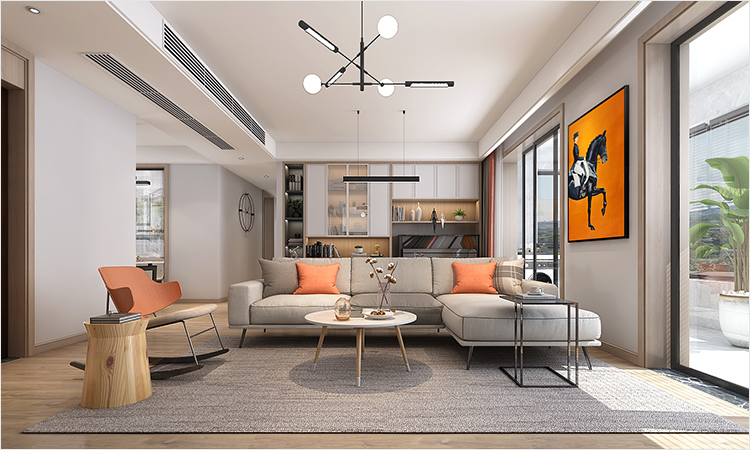 以黑白灰三色調為主色調,營造出簡約大氣的氣質。再加入時下流行的愛馬仕橙,為空間調入時尚與活力。沙發背景墻采用護墻板材質,讓客廳充滿高級感。