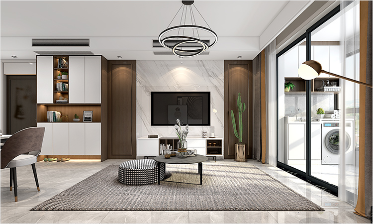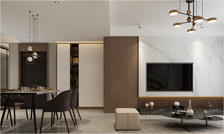 整體內嵌式電視背景墻設計,把電視機藏進墻面,避免了掛在墻上產生的突兀感。白色墻面與黑色地臺的撞色設計,給人簡潔而時尚的視覺效果。側邊安排上收納柜,可以更好的收納客廳雜物。