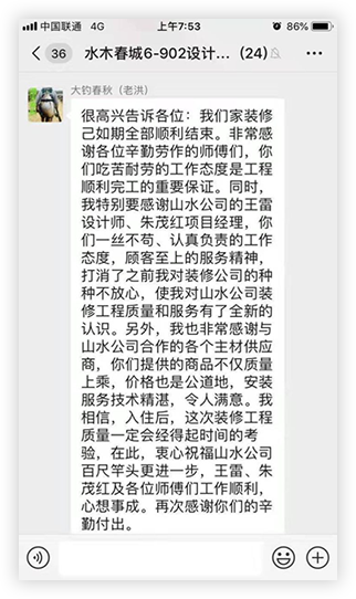 合肥裝修公司口碑哪家好?山水裝飾得到客戶好評:工藝精湛、服務一流