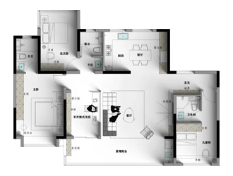 多功能橫廳滿足居者不同的生活需求,將陽臺擴充進來增加進光量,提高空間利用率。廚房改開放式,餐廚一體動線更流暢,互動性也更強。客衛將干區外移,避免使用功能互相干擾。