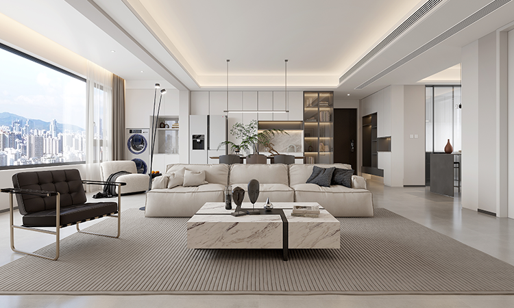 將陽臺納入客廳,橫廳劃分成客廳與書房,實現一廳多用。各空間定制大量儲物柜,滿足不同收納需求。多功能套房布局確保每位居者都有專屬空間,迎合居者對高品質生活的追求。