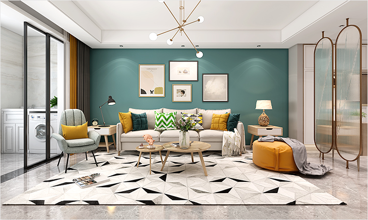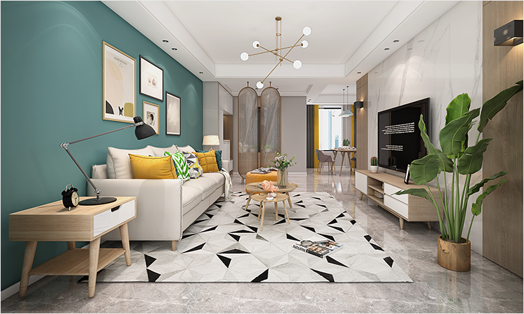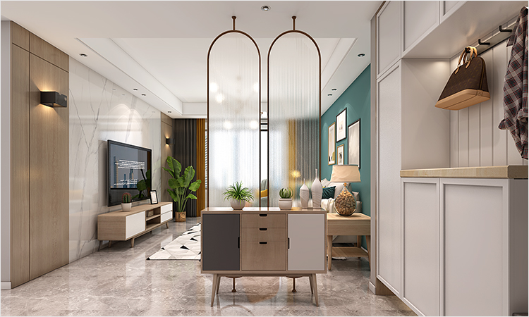 鞋柜+屏風(fēng)將入戶玄關(guān)與客廳進行了空間分割,保持了視覺上的通透。大量白色的運用給人一種簡潔而干凈的視覺感受,沙發(fā)墻的深綠則帶來了跳脫感,賦予空間更多活力。