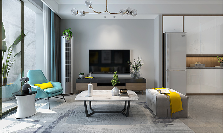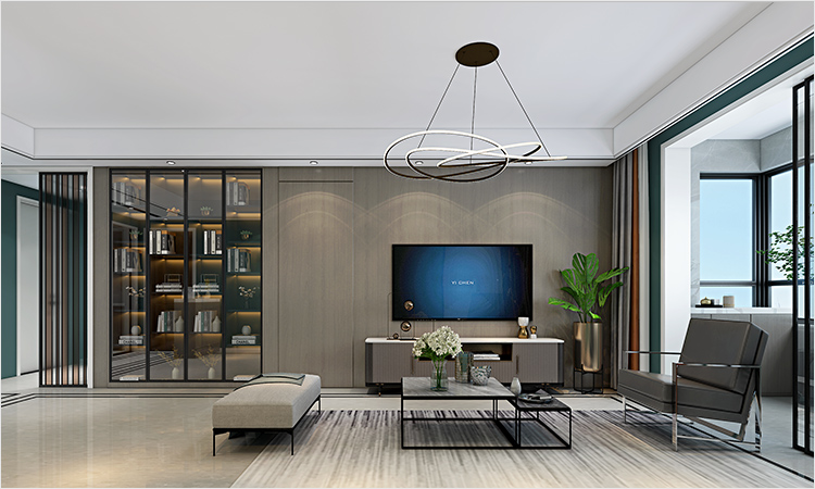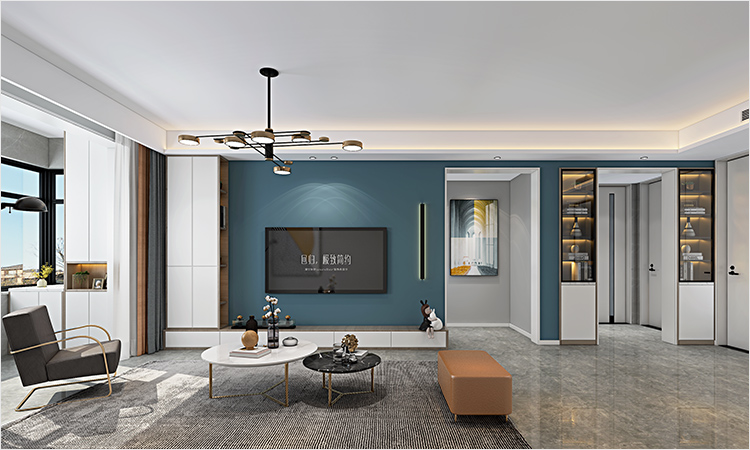 三室兩廳的方正戶型,整體空間開(kāi)闊通透,保證了充足的采光和通風(fēng)。深藍(lán)色的電視墻與白色的柜體從視覺(jué)上形成了強(qiáng)烈的對(duì)比,簡(jiǎn)潔而時(shí)尚,搭配著造型簡(jiǎn)單的組合茶幾,整個(gè)空間便給人一種現(xiàn)代時(shí)尚氣息。