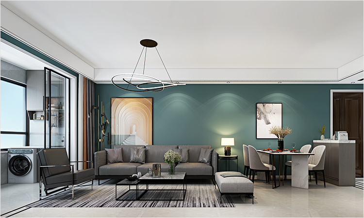 深淺色調(diào)過(guò)渡明顯的空間,三室兩廳的戶型設(shè)計(jì),空間通透感比較強(qiáng),有較大的活動(dòng)區(qū)域。客餐廳的整體布局上強(qiáng)調(diào)的是簡(jiǎn)約美,深綠色的墻面給人以強(qiáng)烈的視覺(jué)沖擊力,彰顯個(gè)性化。