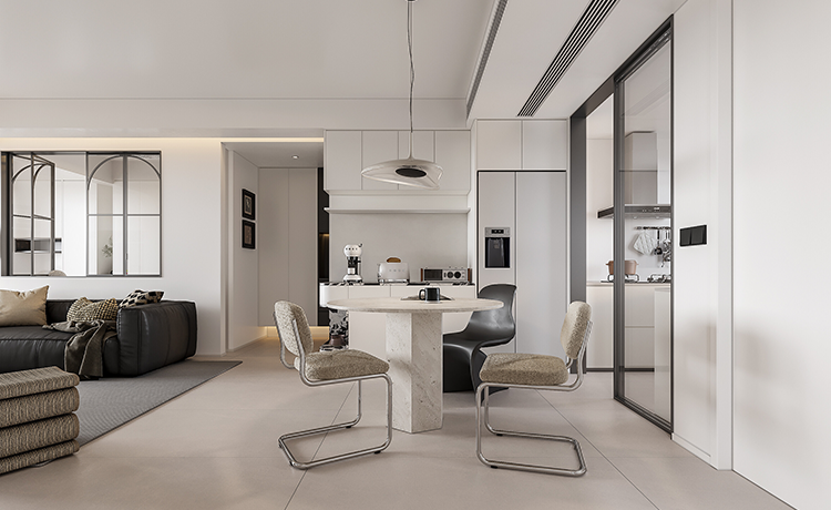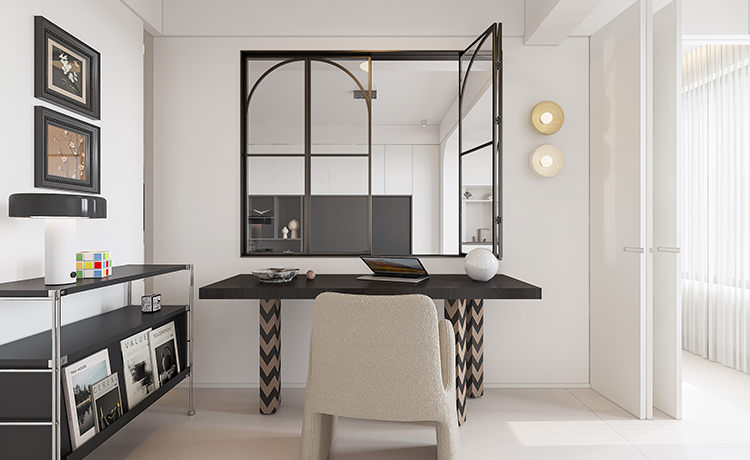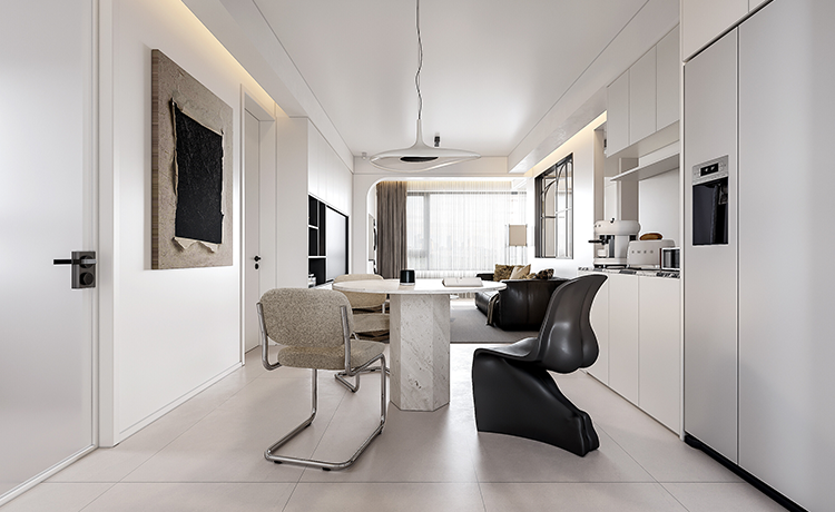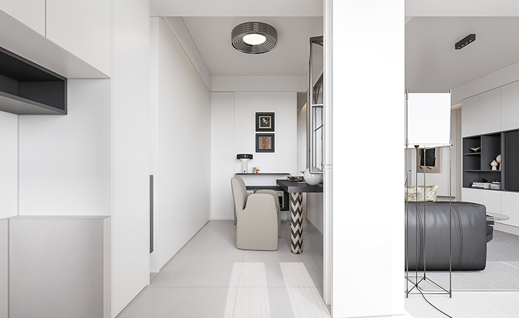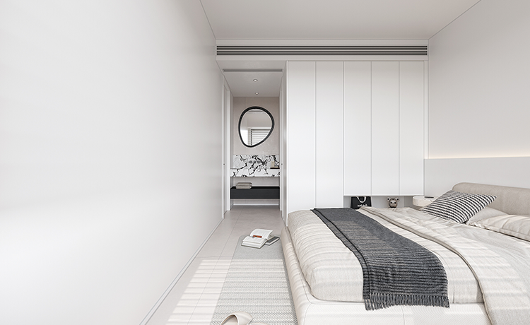 陽(yáng)臺(tái)并入客廳,并與相連的書(shū)房打通,形成雙動(dòng)線(xiàn)布局。保留雙衛(wèi)布局,并做干濕分離,迎合居住者的個(gè)性化生活需求。主臥室擴(kuò)容,提高睡眠環(huán)境的舒適度。
