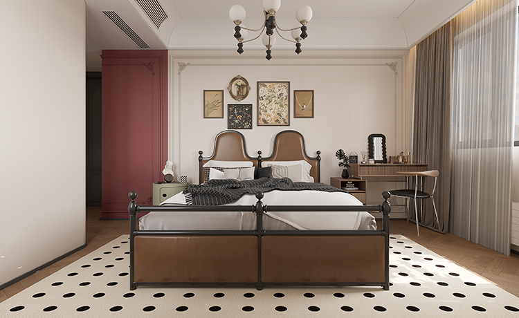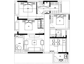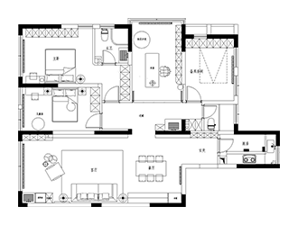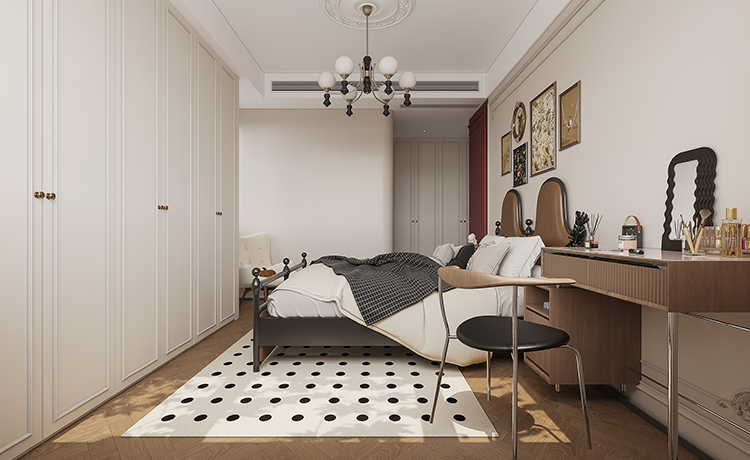 從主臥讓渡部分空間給南次臥,布局與動線更加規整、流暢。拆墻改雙面柜設計,同時兼顧隔斷與收納雙重功能。北次臥向外擴充,增加可利用面積。主臥室與旁邊的小次臥打通,形成多功能套房布局。