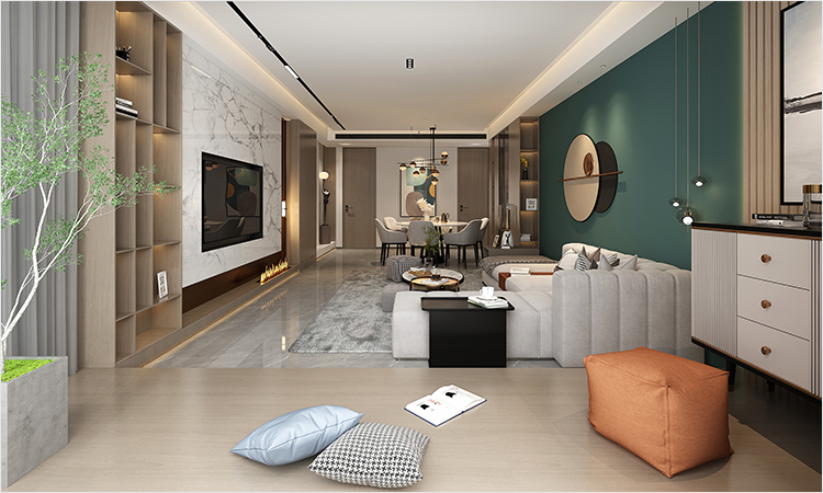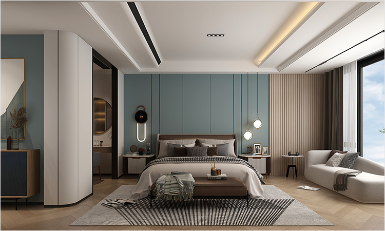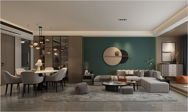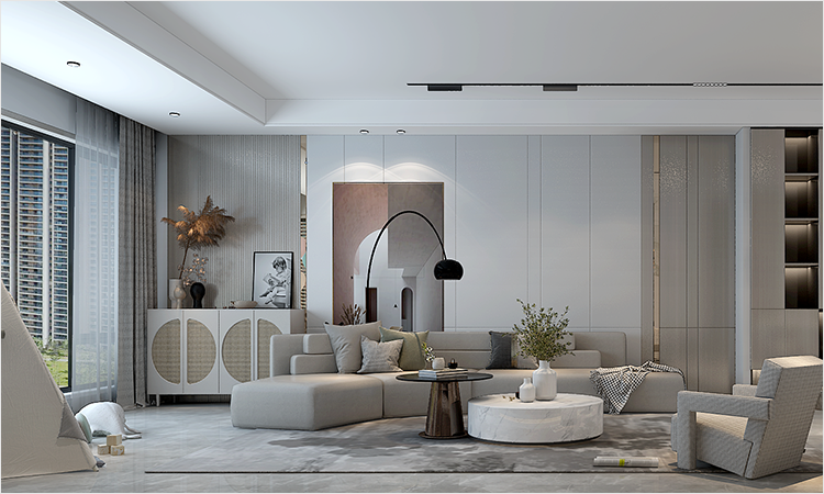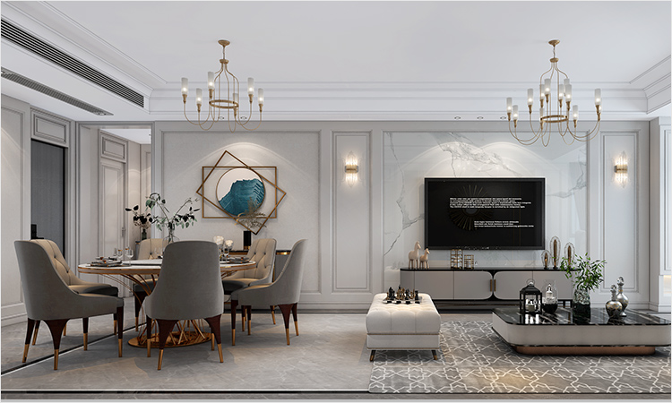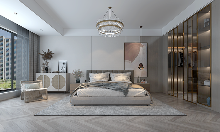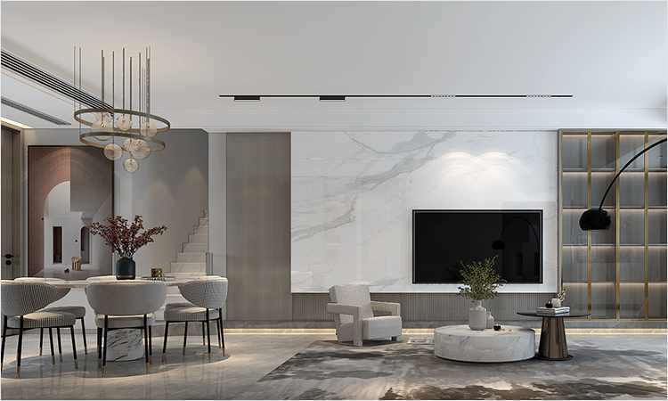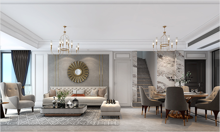 三室兩廳復式結構,布局合理,超大的陽臺直接納入客廳,封閉式設計既保證了室內充足的自然采光,又保護了居住的私密性。淺色調的墻面金屬線條與裝飾品的加入,讓空間多了些輕奢質感。