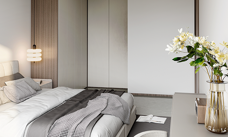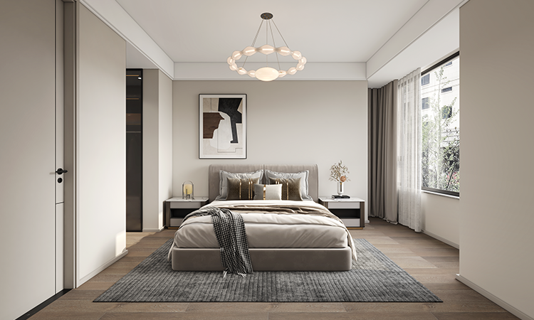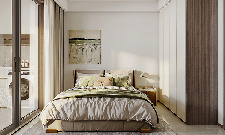 橫廳改成客廳和臥室,三居室布局滿足居者生活需求。主臥室與陽(yáng)臺(tái)打通,增加可利用面積,套房布局私密性更強(qiáng),提升生活品質(zhì)。入戶(hù)處增加儲(chǔ)物空間,為生活提供便利。