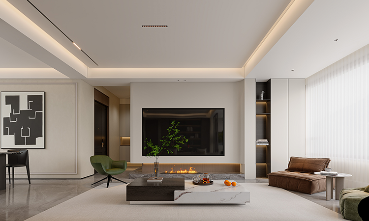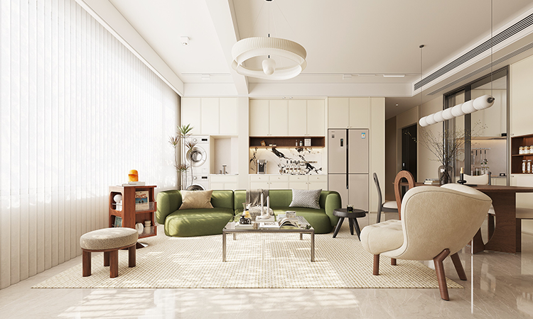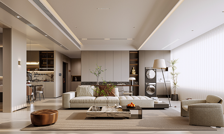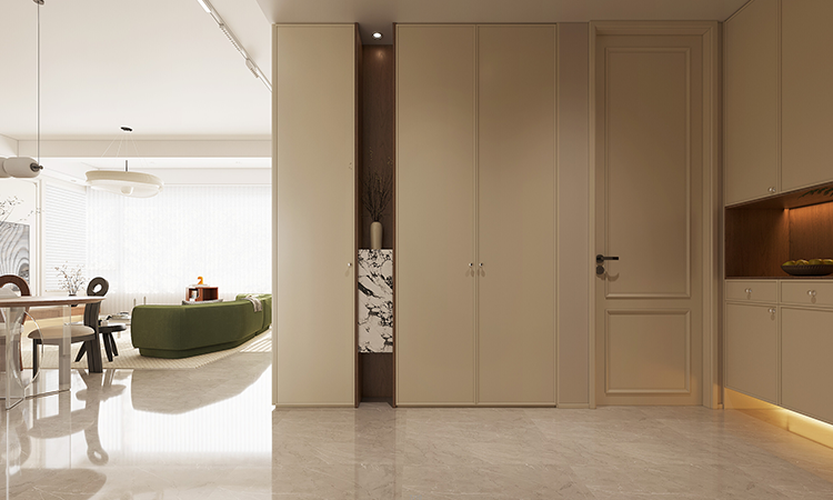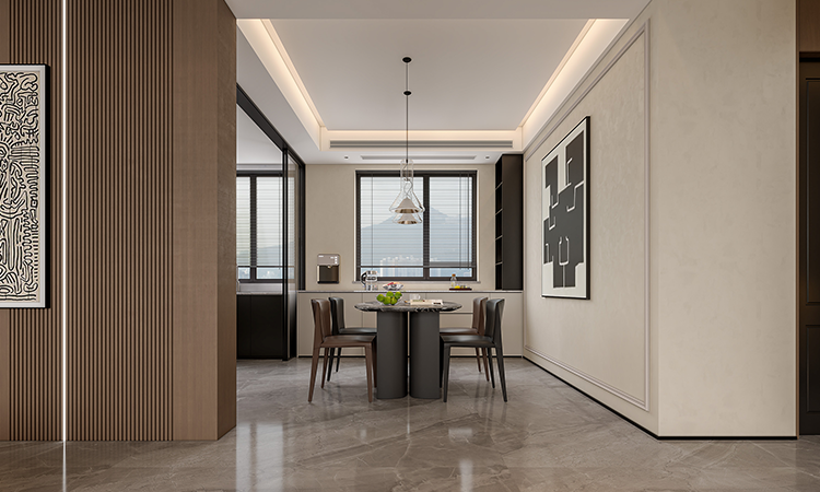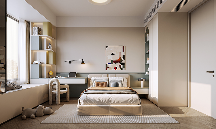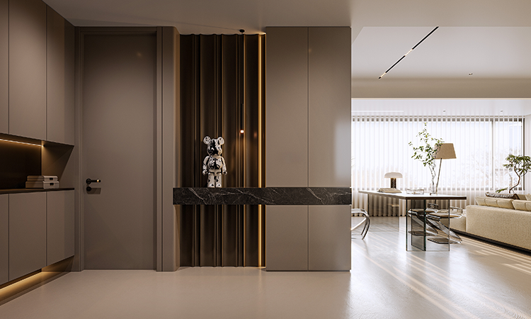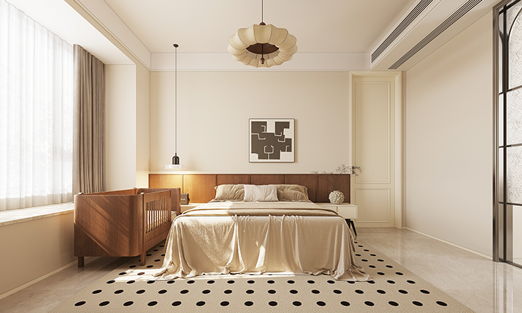 調整玄關位置,預留空間定制玄關柜,增加儲物區。客廳與陽臺打通,沙發后方增加水吧臺區域,也發揮著簡餐區的功能。主臥室一側預留空間用來放置嬰兒床,滿足個性化需求。