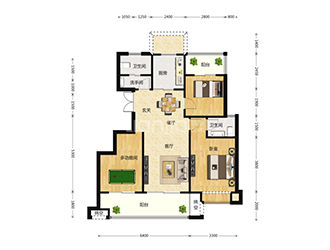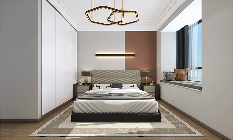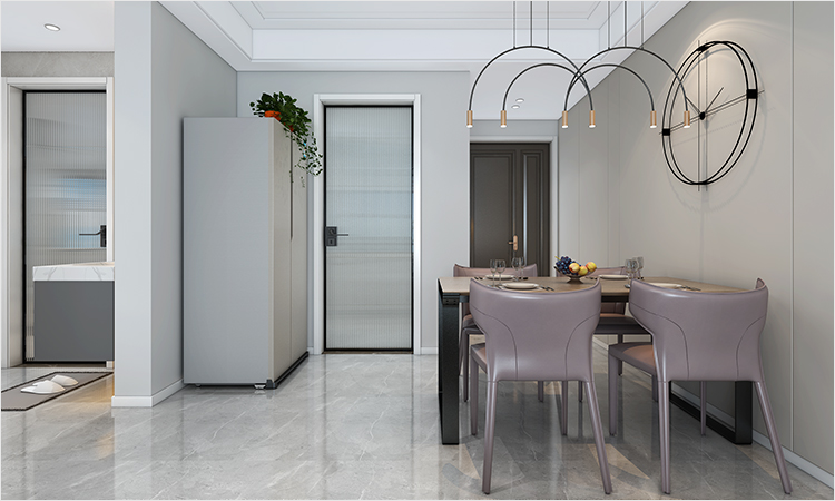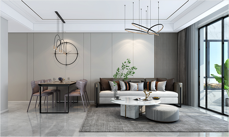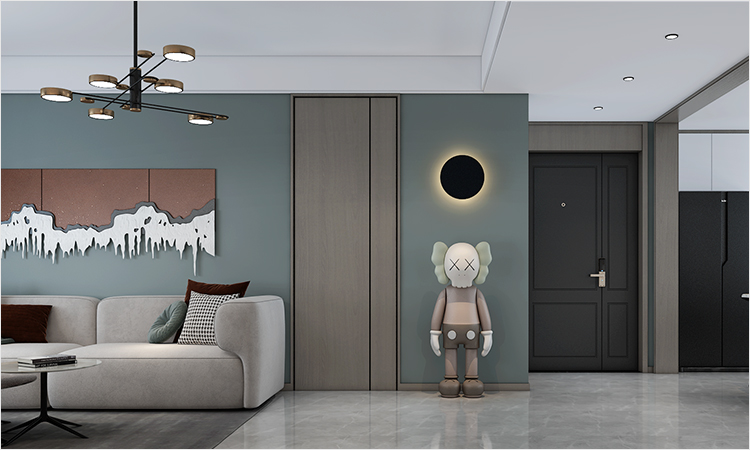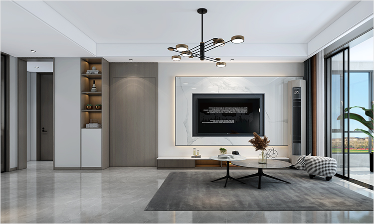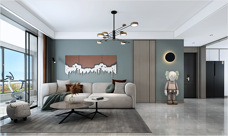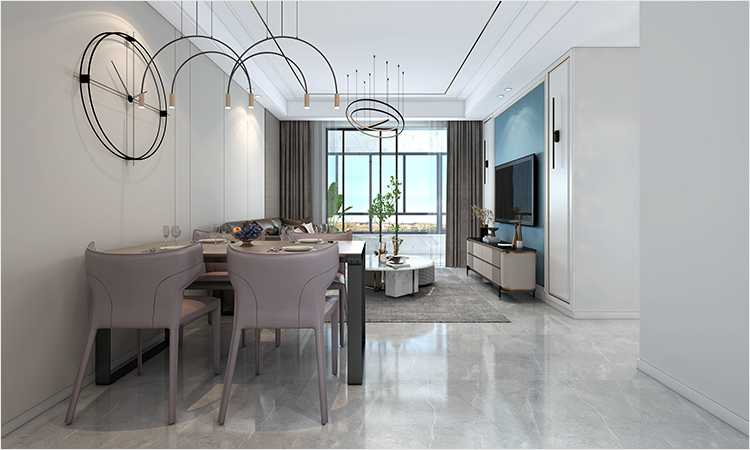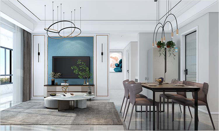 雙陽臺設計的三室兩廳戶型,以白色作為主體色調,電視墻的湖藍點綴,形成視覺上的強烈沖擊,緩和了純白色的單調感。大量線條的加入,在完成造型的勾勒之外,還豐富了空間層次,提升美觀度。
